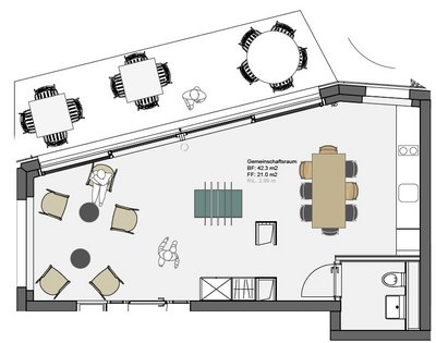 Ein Ort der Begegnung – ein Ort um sich auszutauschen. Der grosszügige Gemeinschaftsraum im Erdgeschoss lädt zum Verweilen ein. Mieterinnen und Mieter können ihren Hobbies gemeinsam nachgehen, Projekte realisieren, kreativ sein oder sich zu einem entspannten Abendessen unter Nachbarinnen und Nachbarn treffen.
